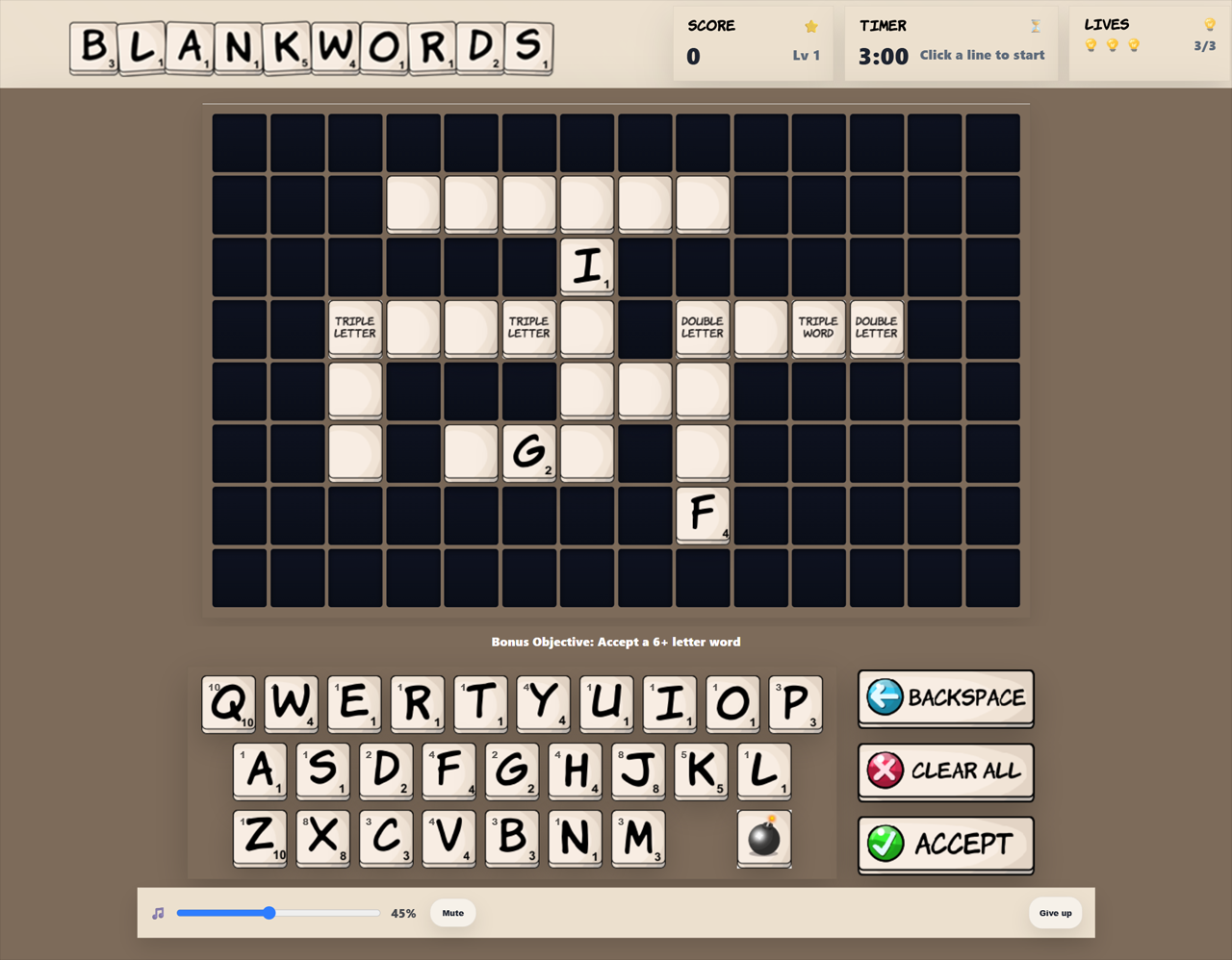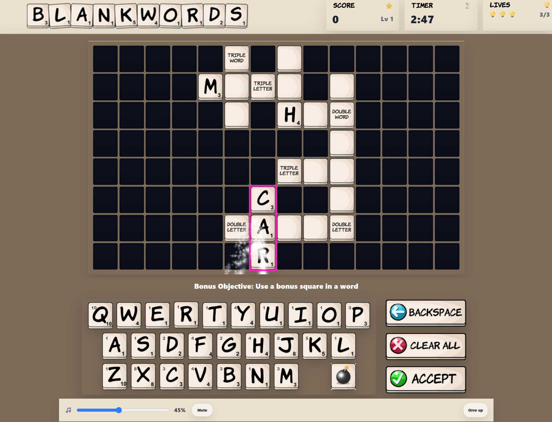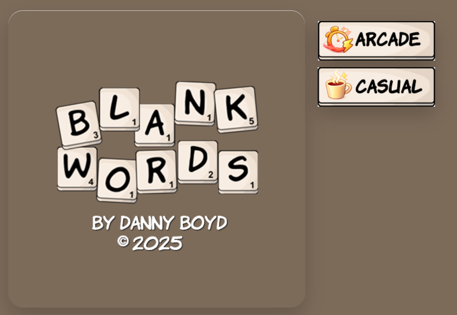 A crossword type puzzle where you fill out the answers with "scrabble-like" tiles and score as much as you can.